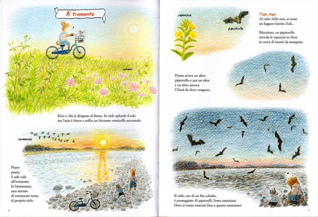 Durante gli ultimi giorni estivi li osserviamo ancora vestiti con abiti leggeri, mentre si rincorrono tra prati fioriti e verdi. L’aria, però, è già fresca, e un venticello frizzante accarezza i loro musetti. Si dirigono verso il fiume, dove il sole, lentamente, scompare all’orizzonte, regalando loro un tramonto dorato. Al calare della sera, con il cielo che si riempie di stelle, ammirano i pipistrelli danzare nel crepuscolo, in cerca di piccoli insetti.