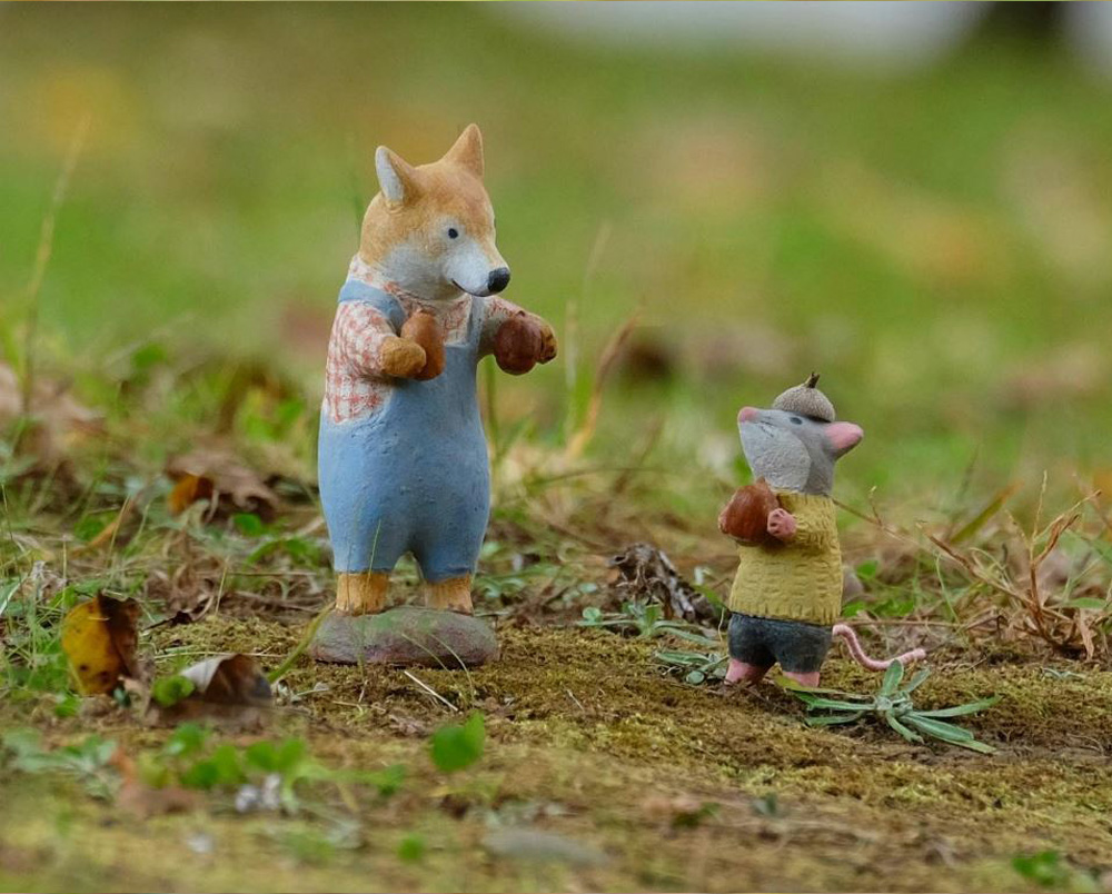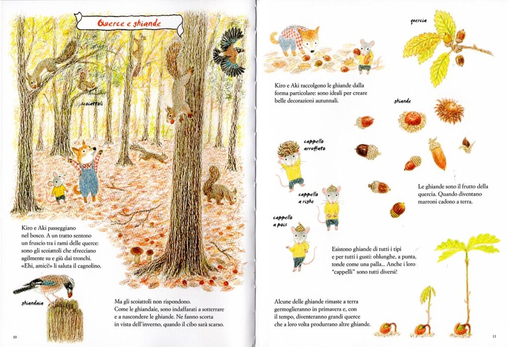 Il bosco, intanto, brulica di vita. Le ghiandaie si spostano tra i rami, mentre gli scoiattoli, laboriosi, nascondono le ghiande per affrontare i mesi freddi. Kiro e Aki raccolgono ghiande dalla forma curiosa, che diventano buffi cappellini per il topolino!