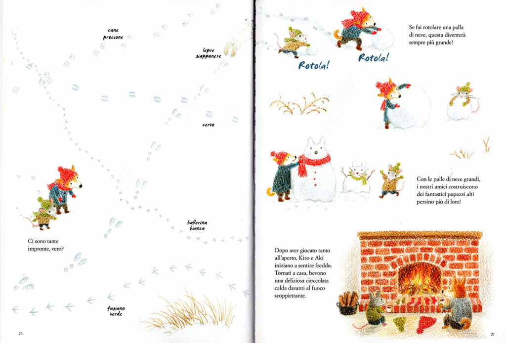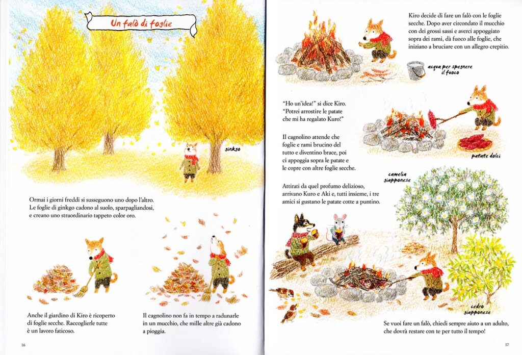 I protagonisti della storia sono il topolino Aki e il suo inseparabile amico, il cagnolino Kiro. Con loro ci immergiamo nella magia dell’autunno e scopriamo come la natura si trasforma per accogliere il freddo, mentre piante e animali si preparano all’arrivo dell’inverno.