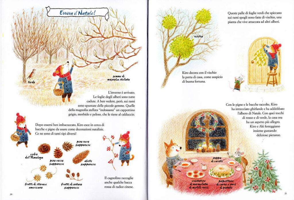 Con l’arrivo del freddo, Kiro nota che sui rami spogli degli alberi stanno già spuntando piccole gemme. Raccolgono bacche, pigne e rami di vischio per decorare la casa e portare un tocco di festa.
