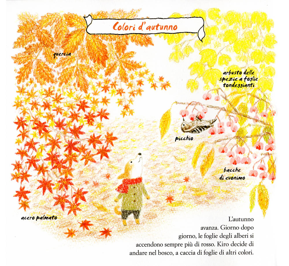Kiro decide di andare nel bosco, a caccia di foglie di altri colori”.