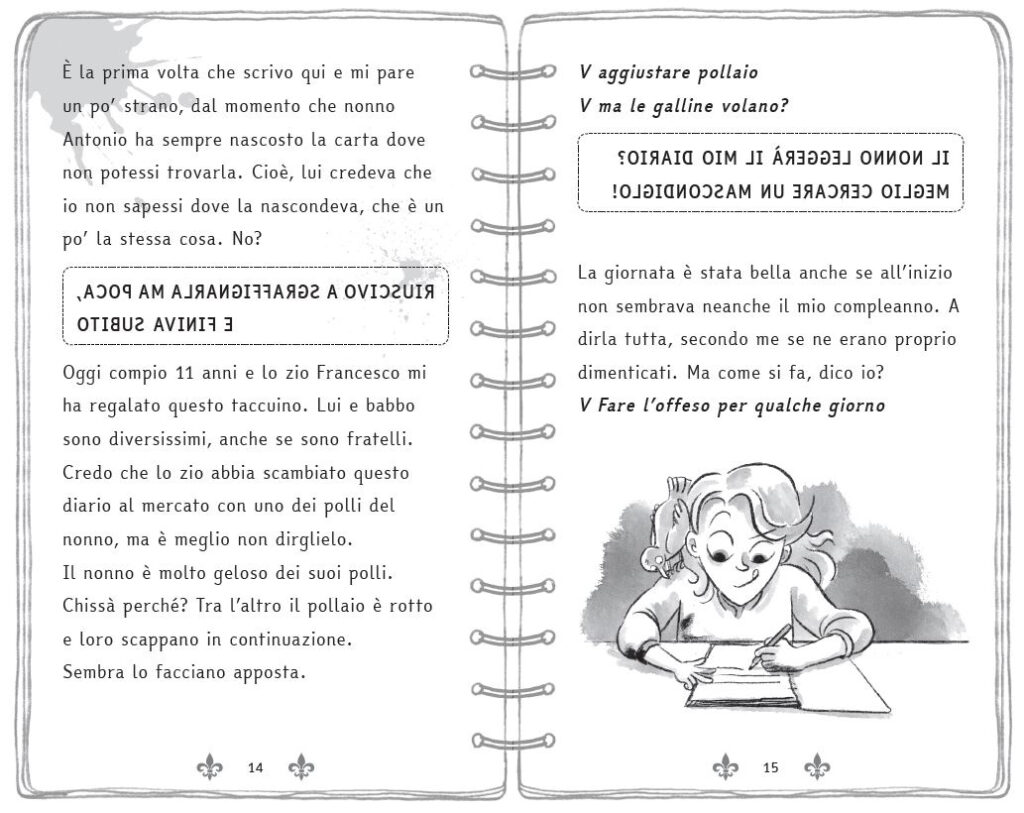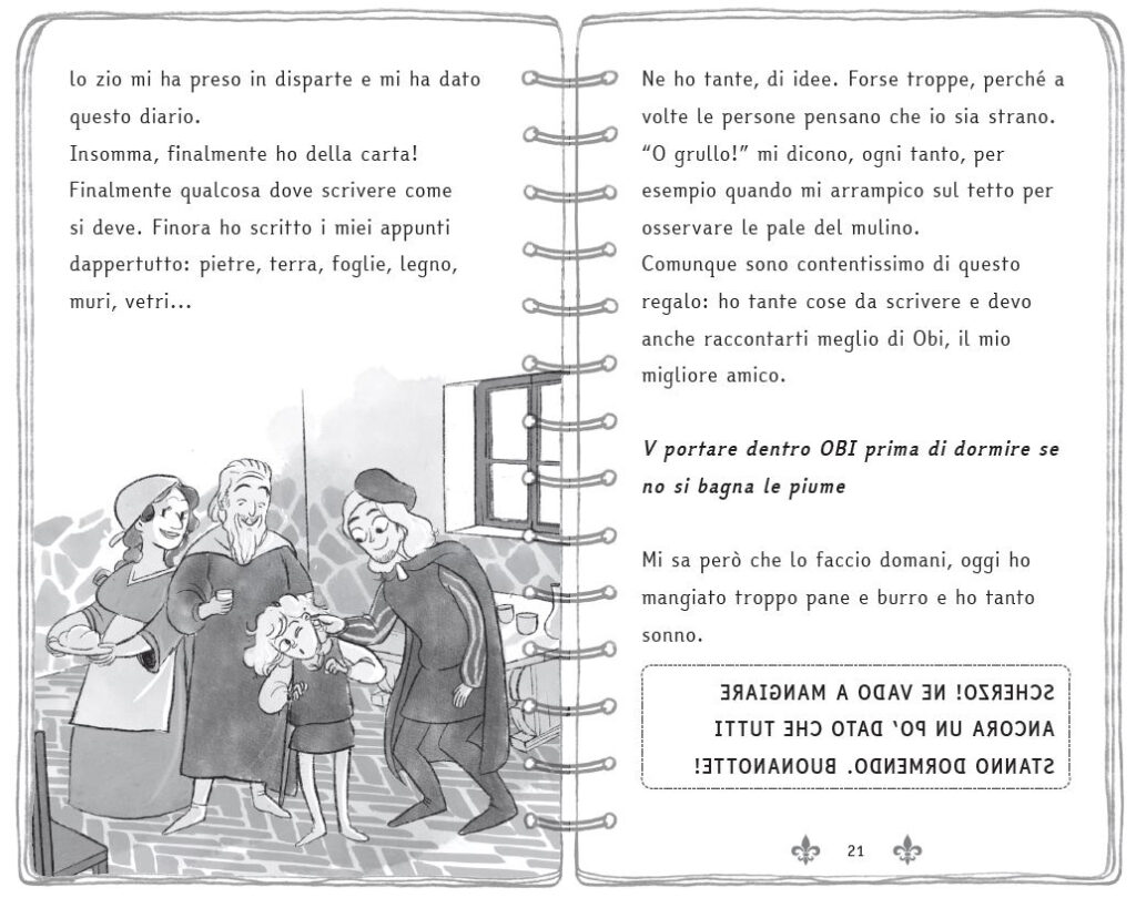 «Sono molto soddisfatta di questo nuovo frizzantissimo (e strampalatissimo) diario. Mi sono davvero divertita a leggere il testo che mi arrivava in presa diretta dall’autrice, giorno dopo giorno. Le avventure e le invenzioni di Leonardo (detto Leo) e del suo pennuto Obi sono perfettamente documentate dal punto di vista storico, ma sono condite con una bella spruzzata di fantasia e umorismo. Sorprese e risate garantite. Parola di editore!».