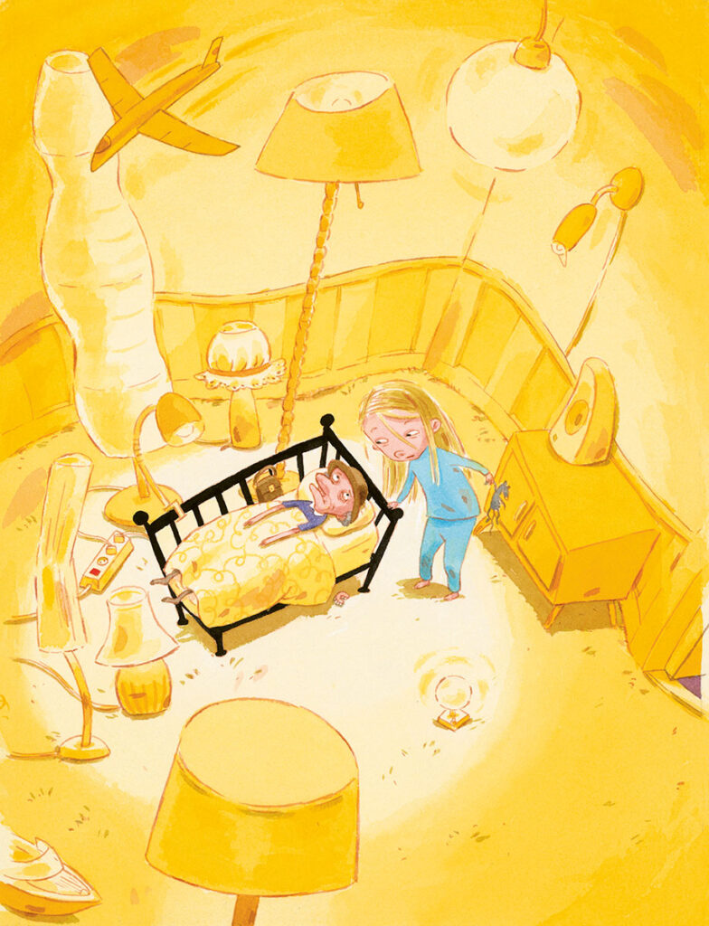Questa dimensione “assurda” diventa la chiave per entrare davvero nel mondo emotivo dei bambini, dove ogni sensazione prende forma e colore. Le illustrazioni, curate dalla stessa Lindenbaum, accompagnano questa trasformazione con una forza visiva sorprendente: ambienti teatrali, prospettive sbilenche, colori che virano dal caldo rassicurante al viola onirico fino al nero profondo della notte.