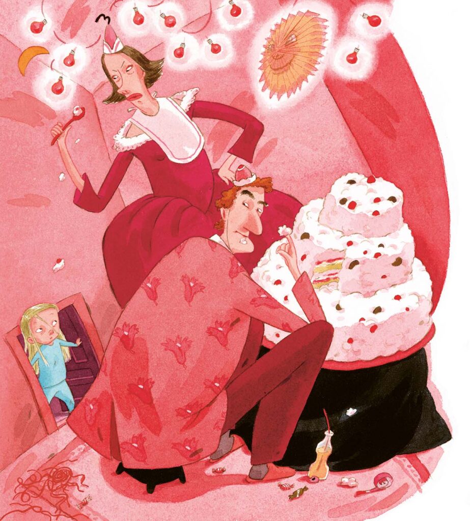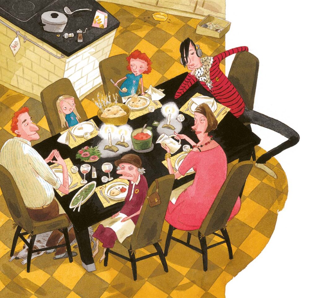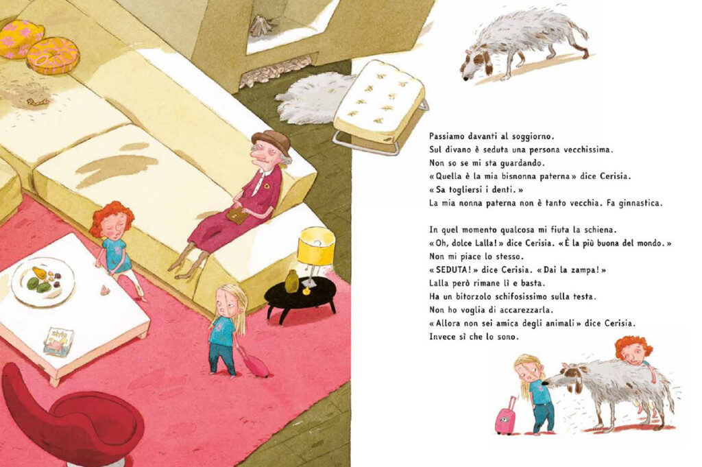 Ogni pagina è disseminata di dettagli stranianti e irresistibili: una bisnonna minuscola che dorme con gli occhi aperti, tassi rumorosi sotto il lavello, un cane con un bitorzolo inquietante. Tutto sembra oscillare tra comicità e disagio, proprio come accade nell’esperienza reale dei bambini.